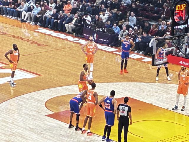 The Cavs took an early 6-2 lead when James Harden hit Donovan Mitchell in front of the Cavs bench for a three with 10:18 remaining in the opening quarter. With 9:00 left Harden drained a three and the Cavs led 13-9. With 5:18 left in the opening quarter the Knicks cut the Cavs lead to 21-19 when Josh Hart drained a three. The Cavs came right back and extended the lead back to four points when Jarrett Allen scored in the paint and was fouled. Allen, who had been struggling from the foul line, missed the free throw. With 1:33 left in the opening quarter the Cavs lead grew to 30-24 when Dean Wade hit a three from the corner. Then with time running out Wade drain another three from in front of the Cavs bench to give the Cavs a 35-26 lead at the end of one period. Mitchell led everyone with nine first quarter points. Hart led the Knicks with seven points. The Cavs outshot the Knicks 54% (14 of 26) to 50% (10 of 20) in the opening period. The Cavs also outrebounded the Knicks 10-8 and forced six Knicks turnovers resulting in seven Cavs points.